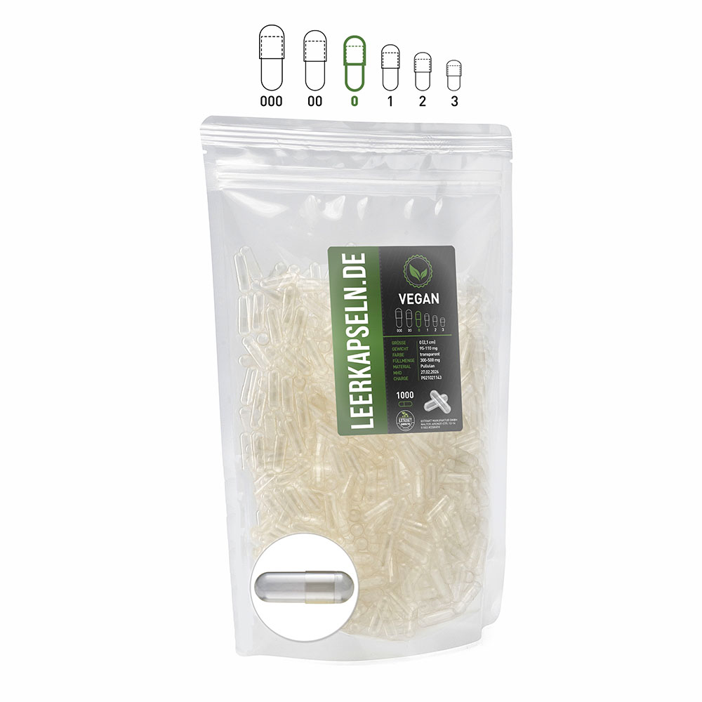 MATERIAL: Die Pullulan Kapseln sind transparent, geschmacksneutral, ohne Zusätze (Konservierungsstoffe, Farbstoffe), aus einem natürlichen Rohstoff, vegan und sehr lange haltbar (siehe Etikett)